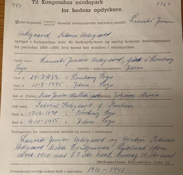 Den citerede levnedsbeskrivelse ender med en anbefaling af, at Laurits og Petrine skal være med blandt dem, der mindes som foregangsmænd og –kvinder i hedeopdyrkningen i deres sogn. Levnedsbeskrivelsen er underskrevet i 1981 af Viggo Larsen, Formand for Hedebruget og Niels Nyholm Nielsen, formand for Hjerm-Ginding Herreders Landboforening.